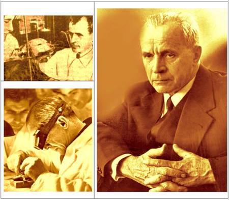 Рис. 1. Н.П. Синицын в разные периоды жизни: слева вверху – при изучении реакций изолированной головы собаки (1930-е гг.); внизу – во время эксперимента на лягушке (Берлин, ГДР, 1955-56 гг.); справа – в 1960-е гг.
