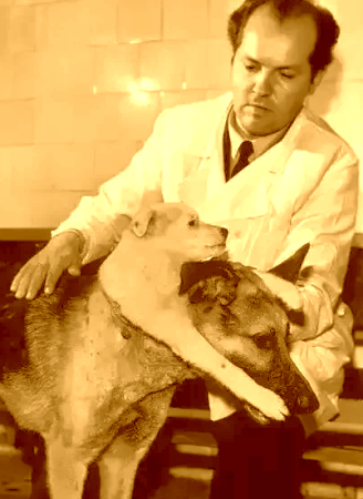 Рис. 4. В.П.Демихов с собакой, которой он подсадил голову и часть туловища с лапой другой собаки (фото из свободного доступа в интернете).